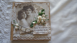 Här har jag dekorerat två skrivböcker 14*14 cm med papper,spets,tårtpapper och gammalt bibelpapper. Vita rosor filmremsa från Tim Holtz bla och ett ordspråk (älskar olika ordspråk). Fint att ge bort som tex gästbok....